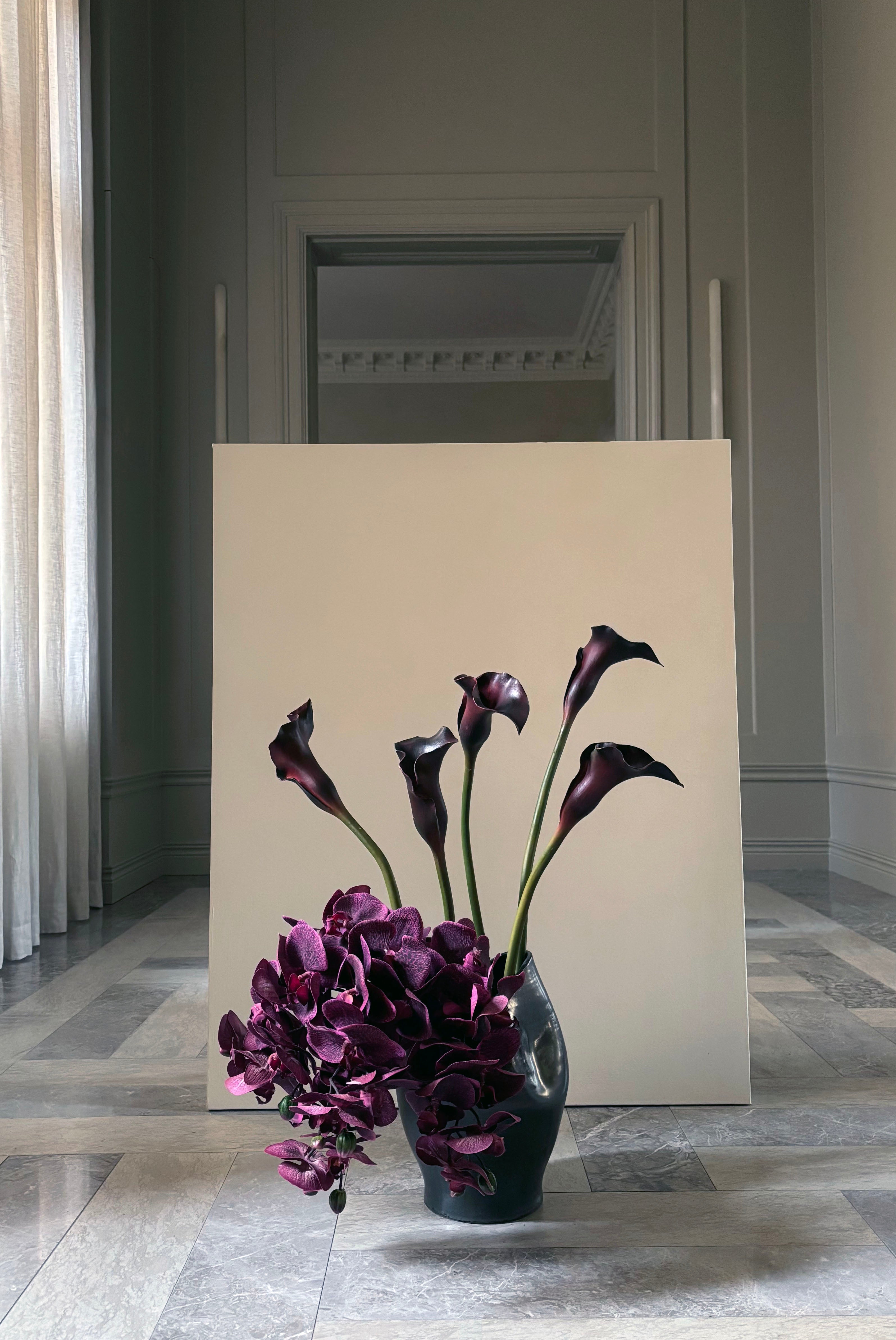 Moody Calla Lilies meet bold Orchids in this curated faux flora bouquet in a midnight setting.