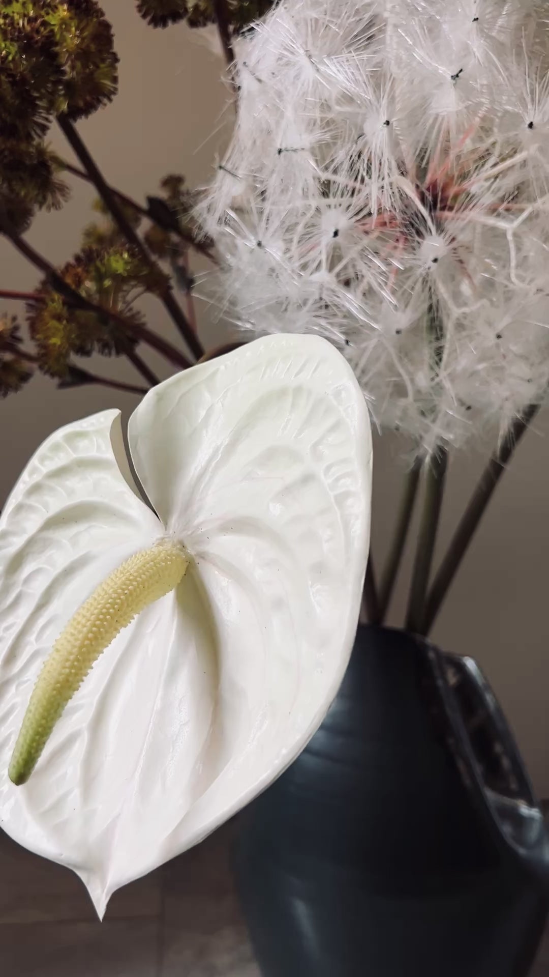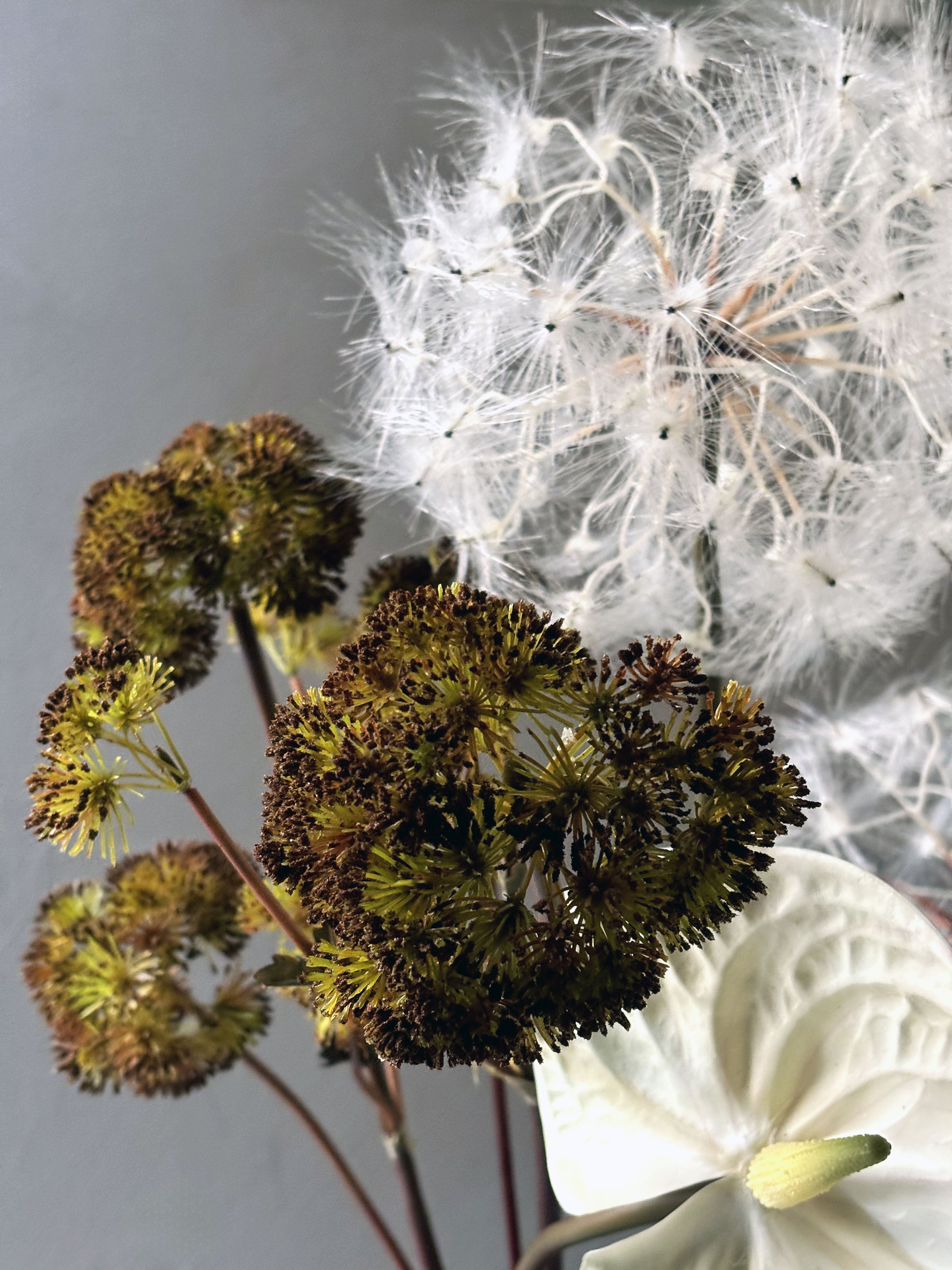 Whimiscal Dandelion heads pair with graceful Angelica stems, alongside with the accent flora Anthurium woven into this faux flora bouquet.