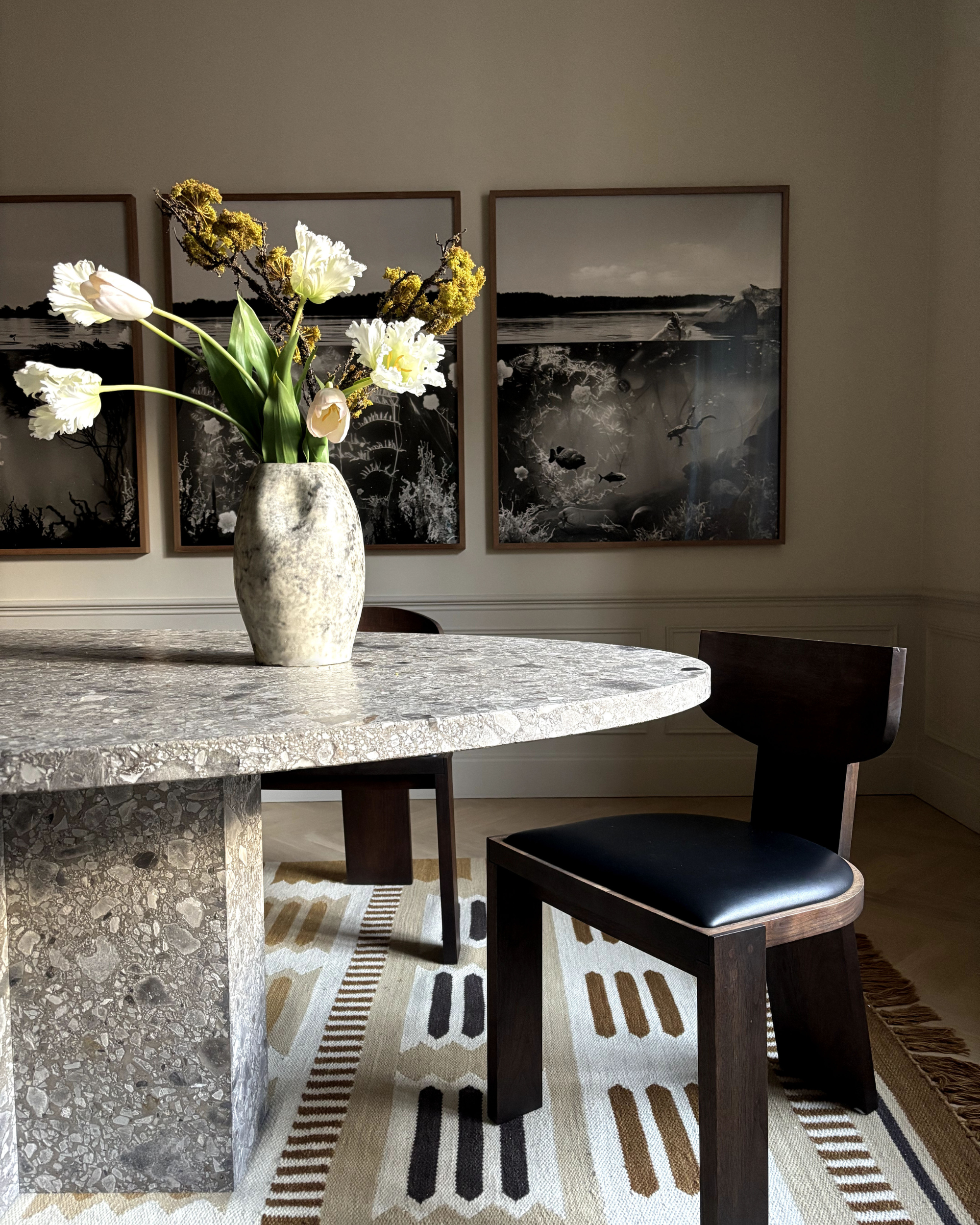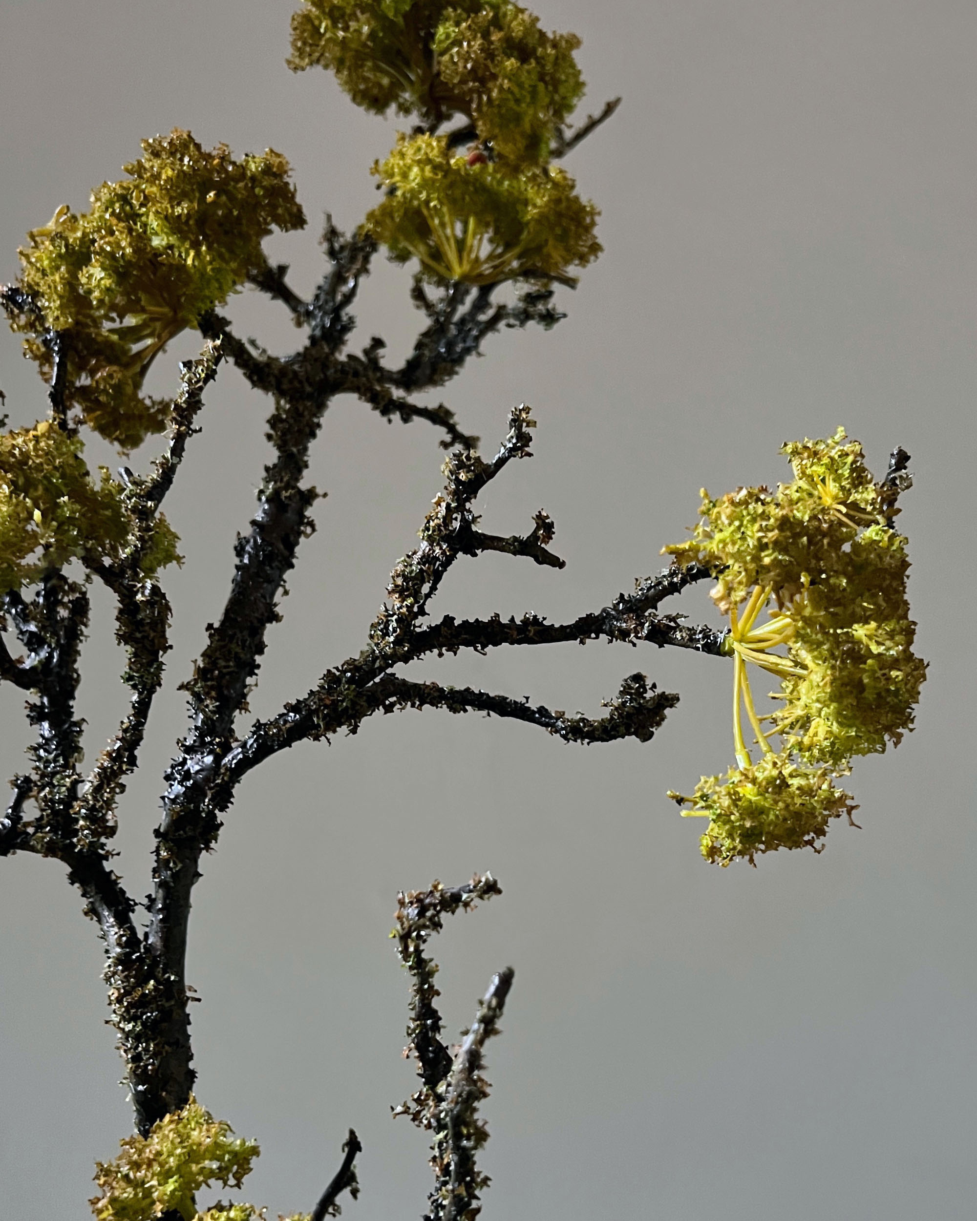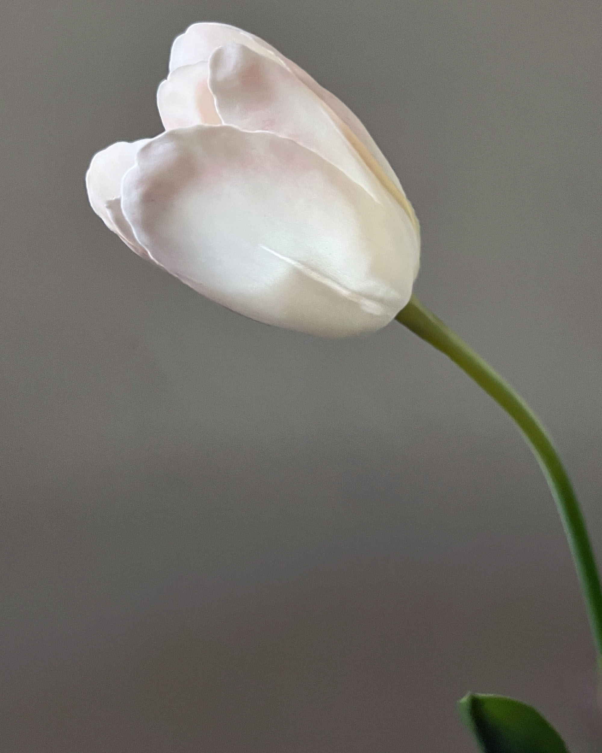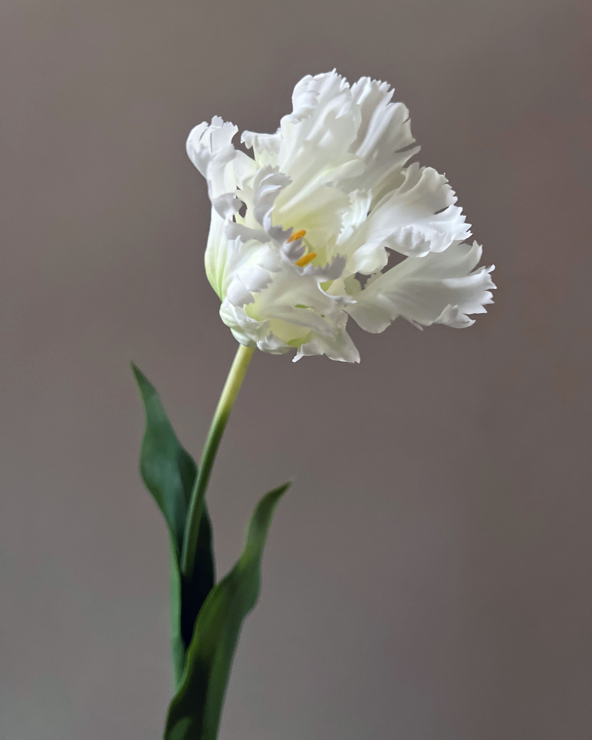 A single moss-covered twig grounds the composition, while bird tulips and tulips unfold in soft, deliberate lines. An interplay of restraint and movement, where botanical form becomes sculptural expression.